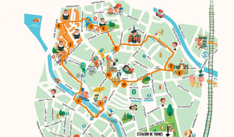 Llegaremos a la Estación de Trenes y en 15 o 20 minutos nos plantamos en Dijlepad (1) para, a pie o en bici, comenzar paralelos al río hasta las fachadas de Haverwerf (2) e ir visitando Gran Beaterio o beguinaje de Malinas (3), la fábrica de cerveza Het Anker (4), la Iglesia de San Juan (5), el Pequeño Beaterio o beguinaje de Malinas (6), Groen Waterke (7), el Palacio de Margarita de Austria (8), el Palacio de Margarita de York e Iglesia de San Pedro y San Pablo (9), Grote Markt, Stadhuis y Schepenhuis (10) y la Catedral de San Romualdo (11)